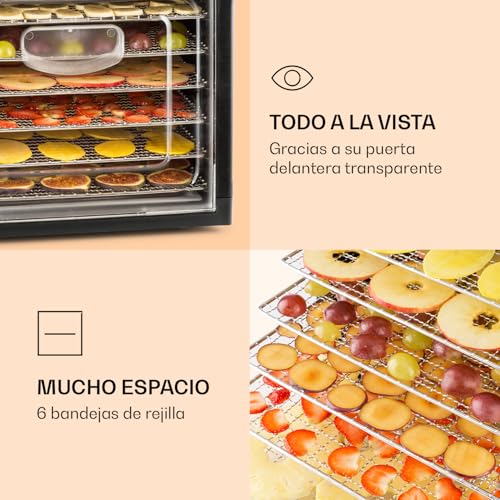 Não há melhor forma de apreciar refeições saudáveis sem aditivos químicos do que utilizar um desidratador como este. Todo o mecanismo está concebido para secar os alimentos através de circulação de ar de alta qualidade. Assim, frutas, vegetais, cogumelos, ervas aromáticas, carnes e peixes reterão até 97% das suas vitaminas e nutrientes.