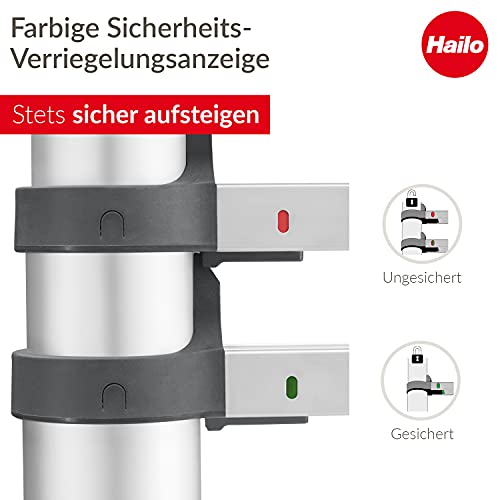 Indicador de bloqueio a cores em cada etapa: Se um degrau da escada telescópica Hailo não estiver devidamente bloqueado, descobrirá através de codificação por cores. De acordo com o fabricante, isto aumenta significativamente a segurança, uma vez que se notam imediatamente erros de fixação.