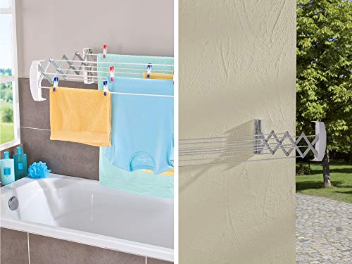 Este pequeno estendal de roupa de alta qualidade montado na parede é ideal para utilização interior e exterior com economia de espaço. Também pode ser usado como um elegante toalheiro na casa de banho, pois o seu design é elegante, confortável e multifuncional.