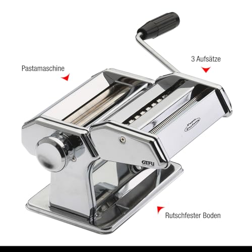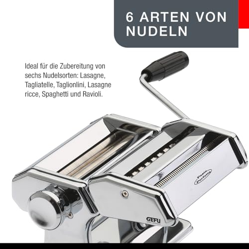 Com esta máquina, a espessura da massa pode ser ajustada de um ajuste de 0,2 a 3 milímetros. Basta ajustar a espessura desejada dos pratos de massa através dos cilindros ajustáveis do aparelho de massajar, feito. A máquina de fazer massa GEFU é alimentada por uma manivela. Em geral, o equipamento da máquina para produção de massa inclui uma base antiderrapante, um parafuso de fixação para garantir um bom suporte durante a preparação da massa e os seis diferentes acessórios.