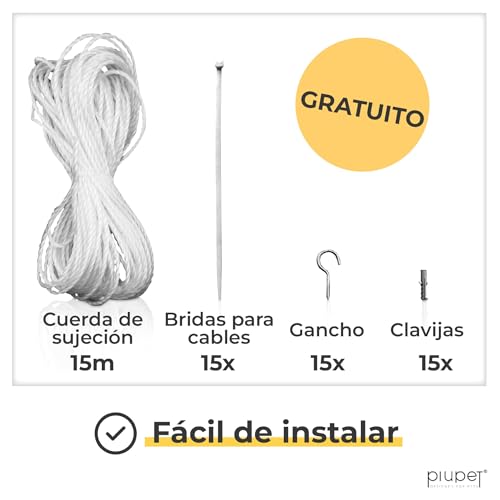 Só está disponível num tamanho de 8x3m e graças à sua transparência, não o impedirá de ver através da sua janela ou varanda normalmente, é fácil de instalar e vem com o seu conjunto de fixação completamente livre que inclui 15m de corda e 15m de cabo de ligação, 15 ganchos e 15 pregos.