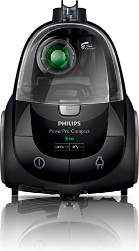 O Philips PowerPro Compact é um dos melhores aspiradores ciclónicos domésticos da marca. O ar que entra é passado a alta velocidade através de uma espiral, de modo que o pó, mais pesado, é depositado num recipiente com capacidade de 1,5, enquanto o ar sai limpo e livre de partículas. Para esvaziar a sujidade, basta retirar o recipiente e despejá-lo no caixote do lixo.