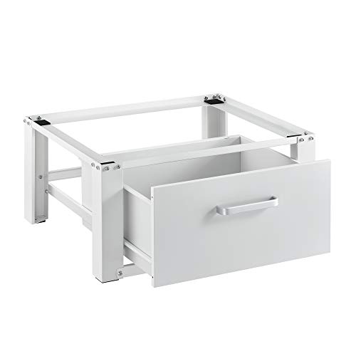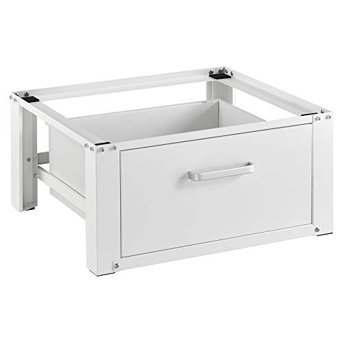Um suporte de máquina de lavar muito interessante para manter detergentes, sabões e outros elementos de limpeza e higiene à mão, é o pedestal En.Casa com uma gaveta armazenável. O material de aço e alumínio confere-lhe uma resistência de 150 kg de peso e se quiser acrescentar qualidade ao produto basta instalar pára-choques de borracha na base para reduzir as vibrações. A elevação de 31 cm aumenta a comodidade de lavar a roupa, já não é necessário dobrar as costas para colocar a roupa no aparelho.