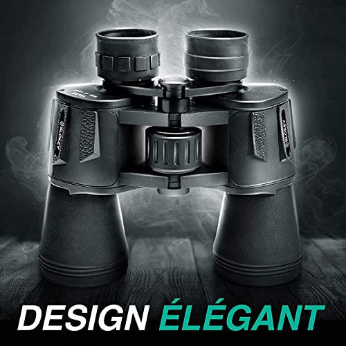 - Abertura de 50 mm: uma grande abertura para deixar entrar muita luz e permitir-lhe ver objectos com pouca luz. Mas não demasiado grandes para que os binóculos não sejam demasiado volumosos e possam ser utilizados sem um tripé.