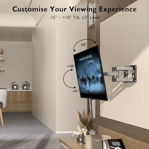 O suporte de parede do televisor permite a máxima flexibilidade, com a capacidade de rodar 60 graus para a esquerda e direita (o ângulo giratório máximo depende do tamanho do televisor) para lhe proporcionar o ângulo de visão mais confortável. Também pode inclinar-se 15 graus para cima e para baixo para eliminar o brilho irritante e reduzir a tensão no pescoço ou nos olhos. Com um ajuste de rotação de ± 3 graus, é possível assegurar um nível bem apresentado.