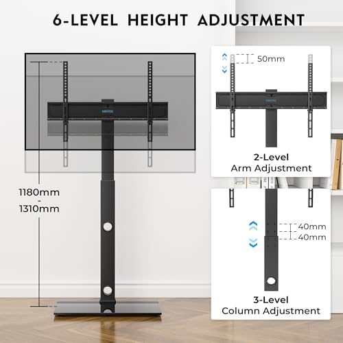 Uma das vantagens do suporte de TV BONTEC Stand TV é a sua giratória e ajuste de altura. O suporte para TV de chão pode rodar 37 graus para a esquerda e para a direita para lhe dar uma vasta gama de ângulos de visualização, e o suporte para TV de pé apresenta 6 níveis de ajuste de altura. Os braços de montagem podem ser ajustados a 2 níveis de altura por 50mm, e a placa pode ser ajustada a 3 níveis de altura por 40mm para uma visualização óptima.
