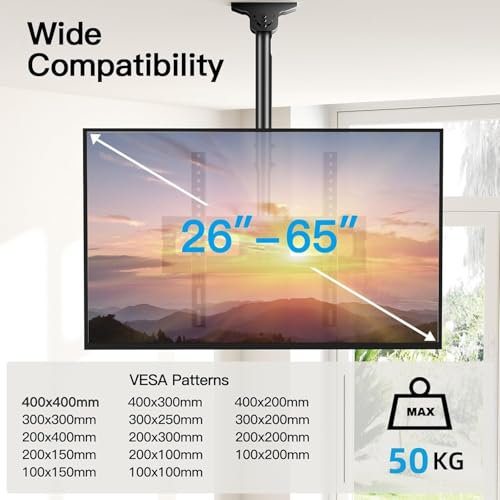 O Suporte de TV de Tecto PERLESMITH é uma excelente escolha para quem procura um suporte de TV que possa ser montado no tecto. Este suporte de TV é compatível com a maioria das televisões de 26″-55″ e pode suportar até 45 kg. O tamanho VESA do suporte de TV é 100×100-400×400 mm, por isso é essencial verificar o padrão de buracos VESA da sua TV antes de comprar.