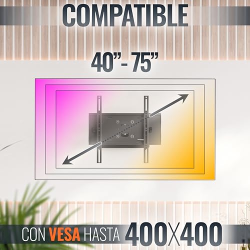 O suporte de parede para TV é compatível com a maioria dos ecrãs planos e curvos de 23 a 70 polegadas, incluindo Samsung, Panasonic, Sharp, Sony, Toshiba, Thomson, LG, Philips, Medion, Hisense, e TCL. Tem uma capacidade máxima de 45kg e é compatível com os orifícios VESA 400×400 / 400×300 / 400×200 / 300×300 / 300×200 / 200×200 / 200×100 / 100×100 / 75×75 / 50x50mm. Antes de comprar, certifique-se de que a especificação VESA, peso, e tamanho da sua TV são compatíveis.