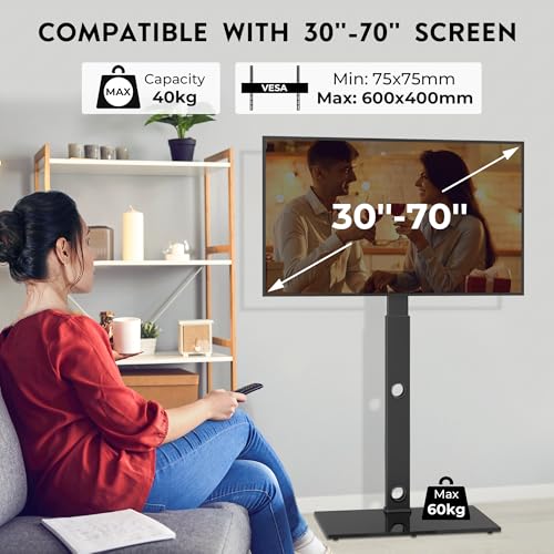 O Suporte de TV com Rodas RFIVER é uma excelente opção para quem procura um suporte de TV versátil e móvel. Este suporte é compatível com a maioria das televisões de ecrã plano ou curvo de 27-60 polegadas e VESA padrão (furo de montagem) de 100(w) mm x 100(h) mm a 400(w) mm x 400(h) mm. É feito de metal e tem um acabamento preto elegante que parece elegante e minimalista.
