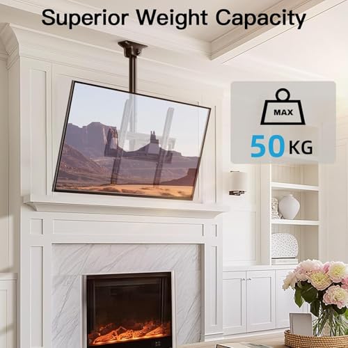 Uma das vantagens deste suporte de TV é que é dobrável e tem um ajuste de inclinação de 0°-128°, o que facilita o seu armazenamento e poupa espaço. É perfeito para utilização no quarto, cozinha, cafetaria, bar, e outras áreas onde o espaço é limitado. O Suporte de TV de Tecto PERLESMITH também oferece suporte de TV em pleno movimento, com a capacidade de rodar ±10° para a máxima flexibilidade de visualização. O ângulo de rotação máximo depende do tamanho da televisão.