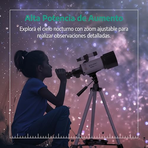 Este telescópio vem acompanhado de um filtro solar de alta qualidade, o que permite a observação segura de manchas solares, eclipses e trânsitos planetários. Além disso, o adaptador de câmara para smartphone incluído possibilita a captura de imagens incríveis dos objetos observados.